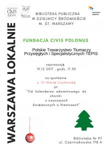 zapraszamy na spotkanie z dr Martą Czyżewską pt. „Od kalendarza adwentowego do choinki – o zwyczajach świątecznych w Niemczech”, które odbędzie się 19 grudnia 2017 r. w Warszawie w Bibliotece nr 97 przy ul. Czerniakowskiej 178A, o godzinie 17.30. Wstęp wolny