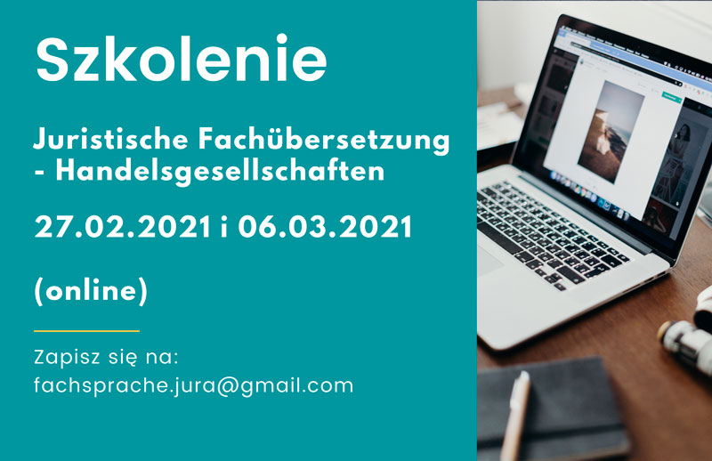 Z uwagi na duże zainteresowanie szkoleniem Juristische Fachübersetzung – Handelsgesellschaften zapraszamy do zapisów na dodatkowy termin szkolenia – I blok: 27.02.2021 r. (sobota) godz. 15:00-18:15, II blok: 06.03.2021 r. (sobota), godz. 15:00-19:15